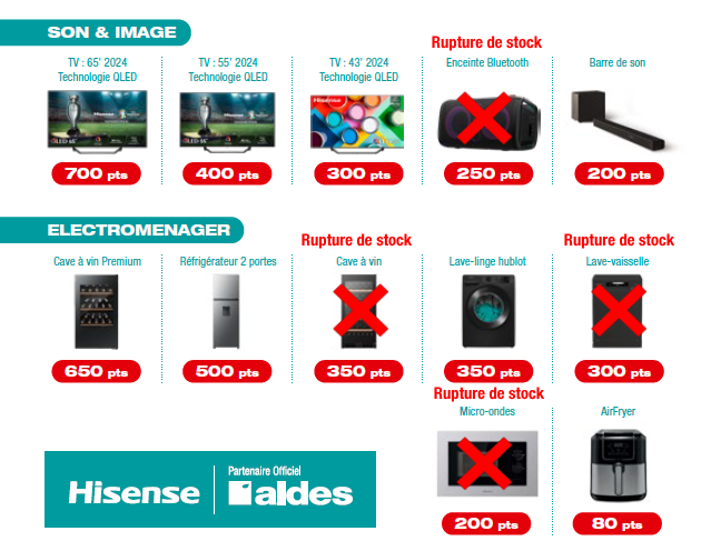 Conditions de l’offre : Jusqu'au 30 juin 2025, pour l’achat de Pompes à chaleur AIR/AIR (monosplit / multisplit résidentiel, monosplit tertiaire) et/ou de Pompes à Chaleur AIR/EAU Hisense(Hi-therma Split, Integra, Monobloc), cumulez des points de fidélité et gagnez des cadeaux Hi-tech(Electroménager ou son et image). Cadeau ni repris ni échangeables. Pour cumuler vos points, remplissez le formulaire en cochant la case “je cumule mes points”. Pour échanger vos points contre le cadeau de votre choix, cochez la case “je choisis mon cadeau”. Offre valable dans les points de vente distributeurs partenaires Aldes participants et à destination desinstallateurs professionnels de l’Électricité et du Sanitaire-Chauffage. Hors web et Market places. Hors marchés, hors prix dérogés et conditions spéciales. Offre valable dans la limite des stocks disponibles pour cette opération. Photos non contractuelles. La dotation est incessible, intransmissible et ne peut être vendue.